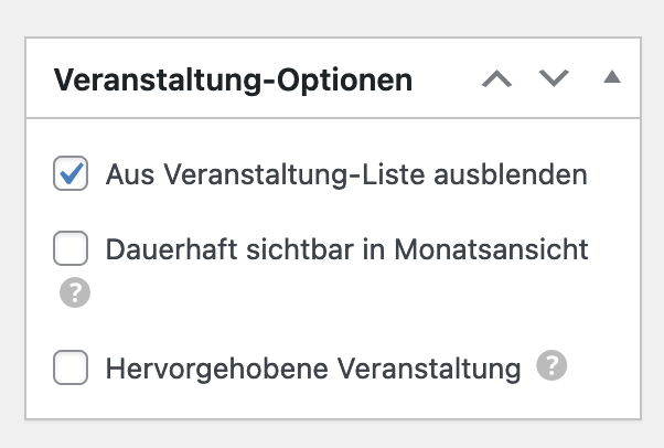 Du kannst den Event aber in der Zwischenzeit ausblenden. Im Menü unter Veranstaltungen den Event suchen und auf Bearbeiten klicken. Anschliessend auf der rechten Seite unter Veranstaltungs-Liste auf die Checkbox Aus Veranstaltung-Liste ausblenden auswählen.