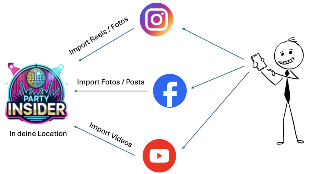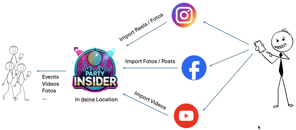 Die Zeichnung zeigt, wie die Inhalte der Webseite gezielt auf Social-Media-Plattformen wie Instagram, Facebook, YouTube verbreitet werden. Dabei bleibt die Party Insider Webseite der zentrale Anlaufpunkt: User können alle relevanten Inhalte direkt auf der Party Insider Homepage in deiner Location finden, ohne zwingend die Social-Media-Kanäle besuchen zu müssen.