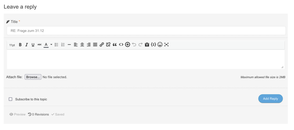 Du kannst einen bestehenden Beitrag (Topic) auswählen und mit Leave a replay eine Antwort hinterlassen: