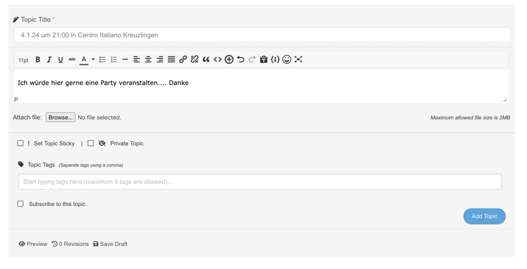 Schreibe im Titel Datum, Uhrzeit und Location und darunter deinen gewünschten Text. Klicke anschliessend auf Add Topic