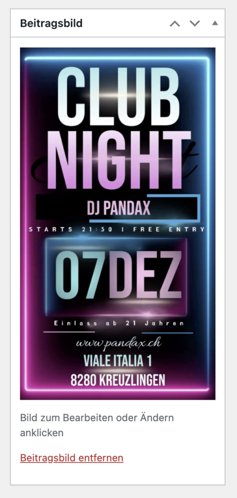 Wenn du einen eigenen Flyer hast, kannst du auf der rechten Menü-Seite auf Beitragsbild festlegen klicken: