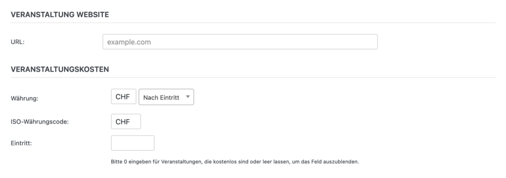 Am Schluss kannst du deine Webseite unter URL und Ticketpreise bei Eintritt eingeben, sofern nötig: