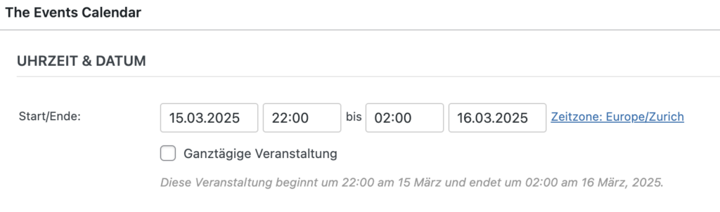 Hier ein Beispiel, wenn die Veranstaltung am 15.03.2025 um 22:00 Uhr beginnt und um 02:00 Uhr nachts endet, dann denke daran den nächsten Tag beim Datum auszuwählen, also in diesem Fall wäre es der 16.03.2025.