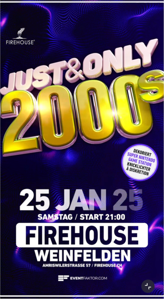Am Samstag, 25. Januar 2025, feiern wir die besten Hits der 2000er Jahre bei der 2000s Just & Only Party im Firehouse Weinfelden! Freu dich auf eine Zeitreise voller legendärer Beats und Erinnerungen an das kultige Jahrzehnt.