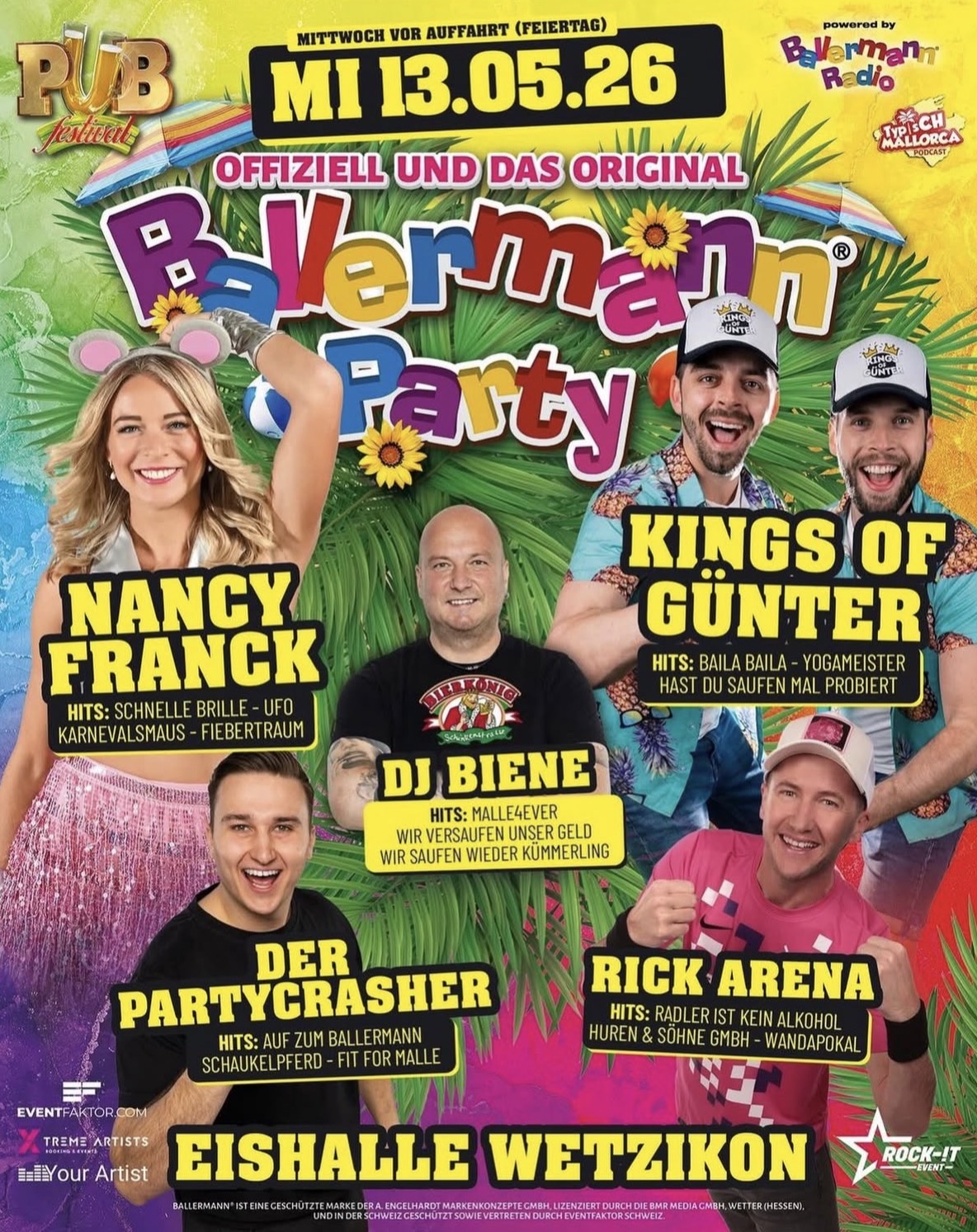 Am 13. Mai 2026 steigt in der Eishalle Wetzikon wieder das offizielle und originale Ballermann Party-Spektakel – und wie jedes Jahr wird’s laut, wild und absolut kultig!