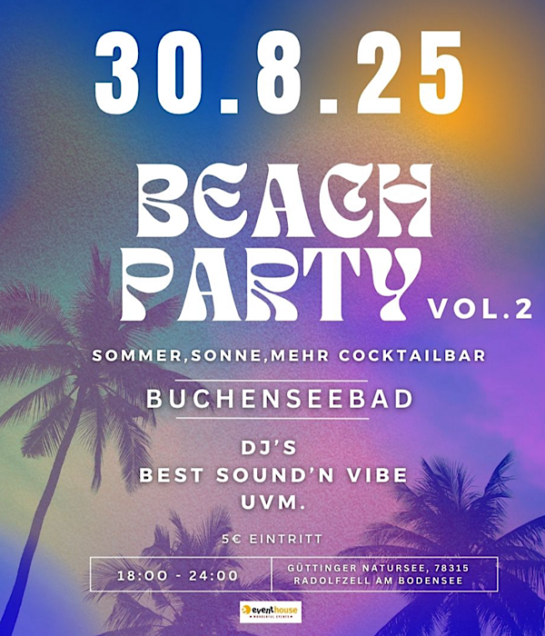 Endlich wieder Sommer! Wir schmeißen am Samstag 30. August 2025 die nächste Beach Party Vol.2 im wunderschönen Buchenseebad am Güttinger Natursee von 18 bis 24 Uhr. Freu Dich auf die DJs von Best Sound’n Vibe, auf eine extra Getränkestation für schnellen Service, erfrischende Cocktails und viele Leckereien.