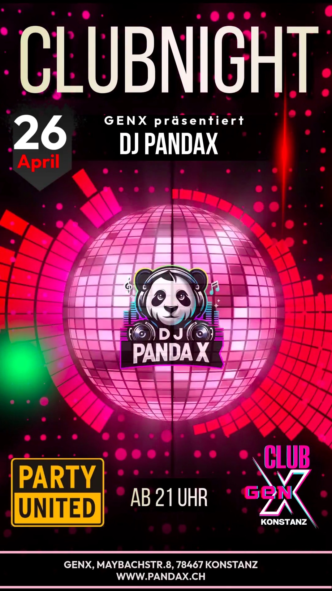 Am Samstag, den 26.04.25, startet DJ PandaX die nächste legendäre Clubnight bei PartyUnited! Freu dich auf fette Beats, eine fesselnde Lightshow und die heißesten Tracks, die den Dancefloor beben lassen. 🔥Sei dabei, wenn PandaX die Nacht zum Tag macht