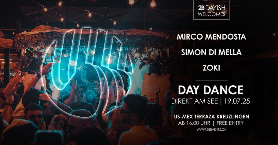 Freu dich auf mitreissende Beats, sommerliche Vibes und elektrisierende Beats direkt am See! Am Samstag tanzen wir am Daydance auf der US-MEX Terraza Kreuzlingen. Tanze unter freiem Himmel, geniesse coole Drinks und den Sonnenuntergang in einzigartiger Atmosphäre. Unsere DJs liefern den perfekten Soundtrack für einen unvergesslichen Sommertag – Open Air, direkt am Wasser und voller Lebensfreude.