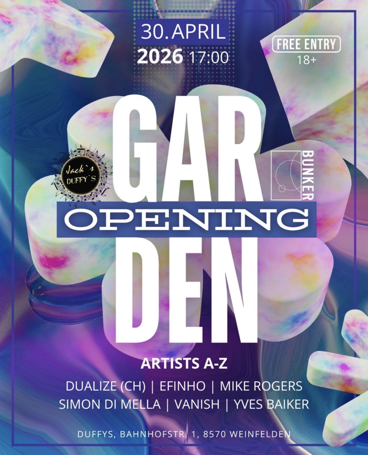 Der Frühling ist da und wir eröffnen gemeinsam den Garten! Am 30.04.2026 ab 17:00 Uhr feiern wir bei Duffys die Gartensaison mit dem BUNKER Label.
