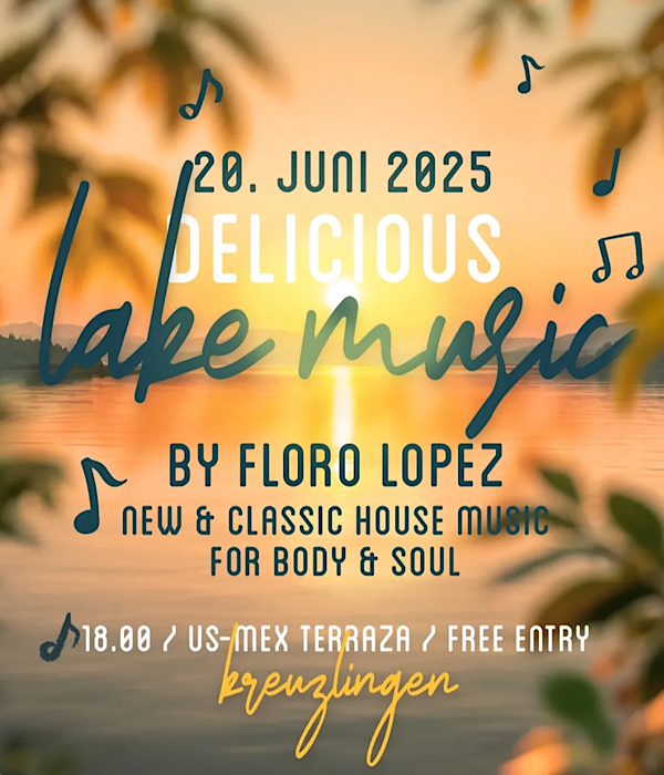 Heute heisst es zurücklehnen, geniessen und den Sommer am See willkommen heissen – mit Delicious Lake Music auf der stilvollen US-MEX Terraza in Kreuzlingen! Floro Lopez bringt feinste Vibes passend zu den heissen Sommertagen mit – perfekt für alle, die Musik für Body & Soul lieben. Zwischen Sonnenuntergang und See-Panorama wird die Terraza zur Tanzfläche und Wohlfühl-Oase zugleich.