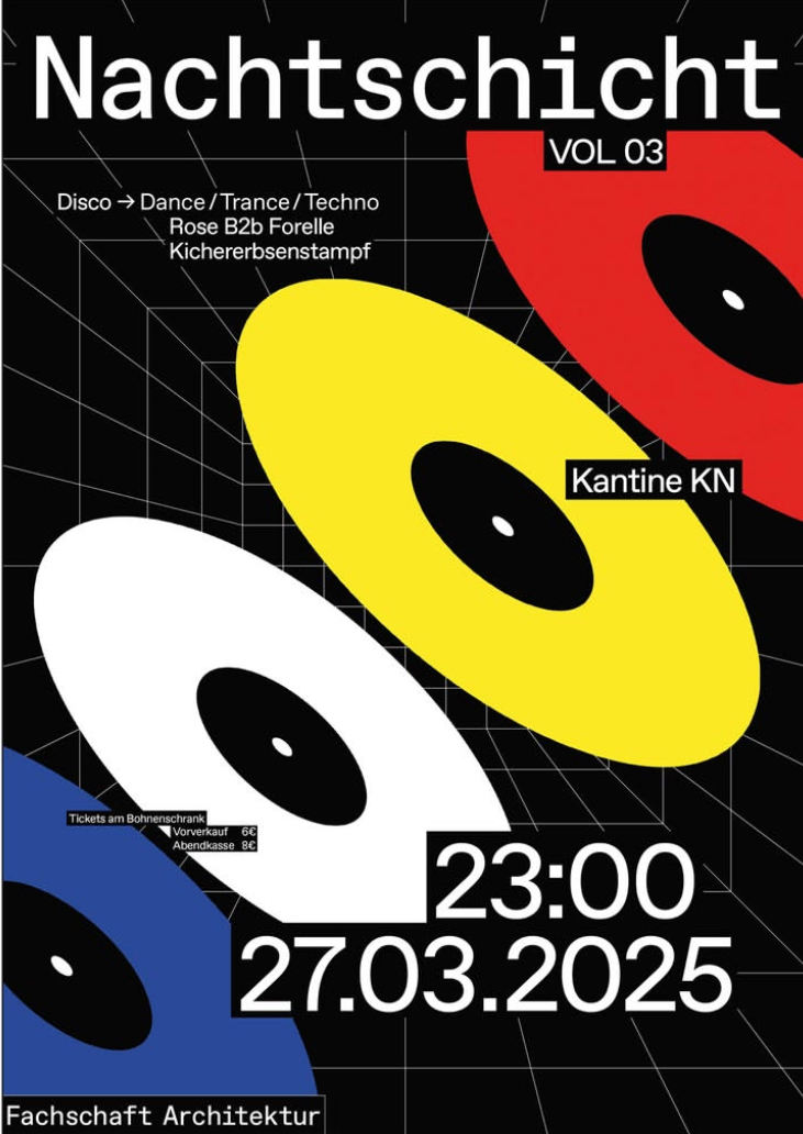 am kommenden donnerstag, den 27.03.2025 findet unsere nachtschicht vol. 03 in der @kantinekn statt. ab montag startet der vorverkauf für 6€ pro ticket am bohnenschrank im masteratelier im bückleareal. seid schnell und sichert euch die tickets – pflichtveranstaltung für alle architekturstudierenden! freund:innen und studierende der anderen fakultäten sind natürlich ebenfalls herzlichst eingeladen zur ersten ar-sause des sommersemesters.