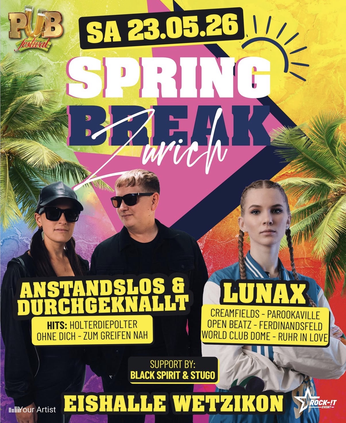 WOW – seit über 20 Jahren ist das Pub Festival in Wetzikon die traditionelle Party im Frühling und verwandelt die Eishalle Wetzikon regelrecht zur grössten Partyhütte im Zürcher Oberland. Im 24. Jahr gibt es wieder die volle Pubpackung mit den besten DJs und unvergesslichen Live-Acts auf der Ohren. Wir präsentieren Euch ein Partyspektakel der besonderen Art.