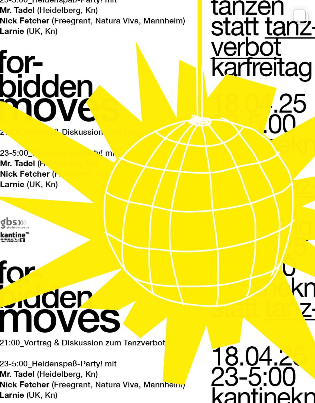 Darf das 2025 noch sein? Dank einer besonderen Kooperation mit dem Verein GBS-Bodensee e.V. darf die Heidenspaßparty „Forbidden Moves – Tanzen statt Tanzverbot» nun trotzdem stattfinden – ohne gläubige Christ:innen dadurch zu stören!