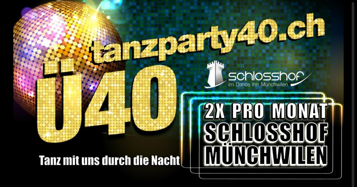 Tanzparty40.ch – Seit Jahren ein Garant für atemberaubende und durchgetanzte Nächte einer lebendigen Ü40 Generation. Ob mit Freunden in der reservierten Lounge, als Paar für einen feinen Cocktail an der Bar oder als Single auf der Tanzfläche, bei uns ist jeder willkommen. Getanzt wird zu Musik aus den 70er über die 80er & 90er bis hin zu den aktuellen Charts, serviert von den angesagtesten Ü40 DJ’s des Landes. Kommt vorbei und seid Teil der kultigsten Ü40 Party-Bewegung der Region – wir freuen uns auf Euch.