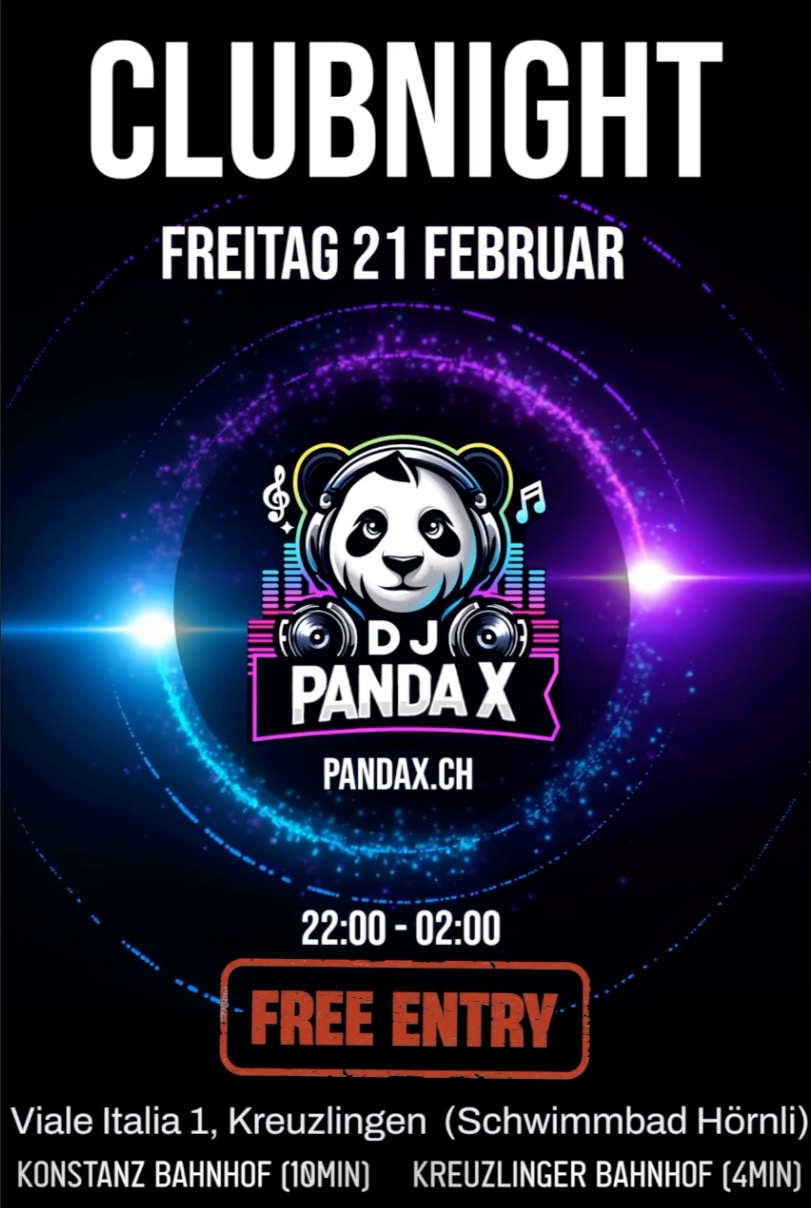 Electronic Night mit DJ PandaX in Kreuzlingen (nähe Schwimmbad Hörnli) Feb. 14 Featured 14 Februar @ 22:00 - 2:00 Electronic Night mit DJ PandaX in Kreuzlingen (nähe Schwimmbad Hörnli)