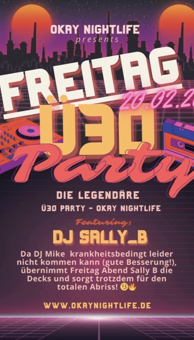 Club Okay Donaueschingen Raiffeisenstrasse 13,Donaueschingen,GermanyUPDATE: DJ MIKE Es bricht uns das Herz: DJ Mike hat es leider erwischt. Wir haben alles versucht, aber die Gesundheit geht vor - wir wünschen dir schnelle Genesung, Mike! Wir vermissen dich jetzt schon an den Decks. ABER: Die Nacht ist gerettet! Keine Geringere als @djsallyb_salvatorebattiato springt ein und wird die Hütte für euch… Weiterlesen »Ü30 Party – Club Okay Donaueschingen