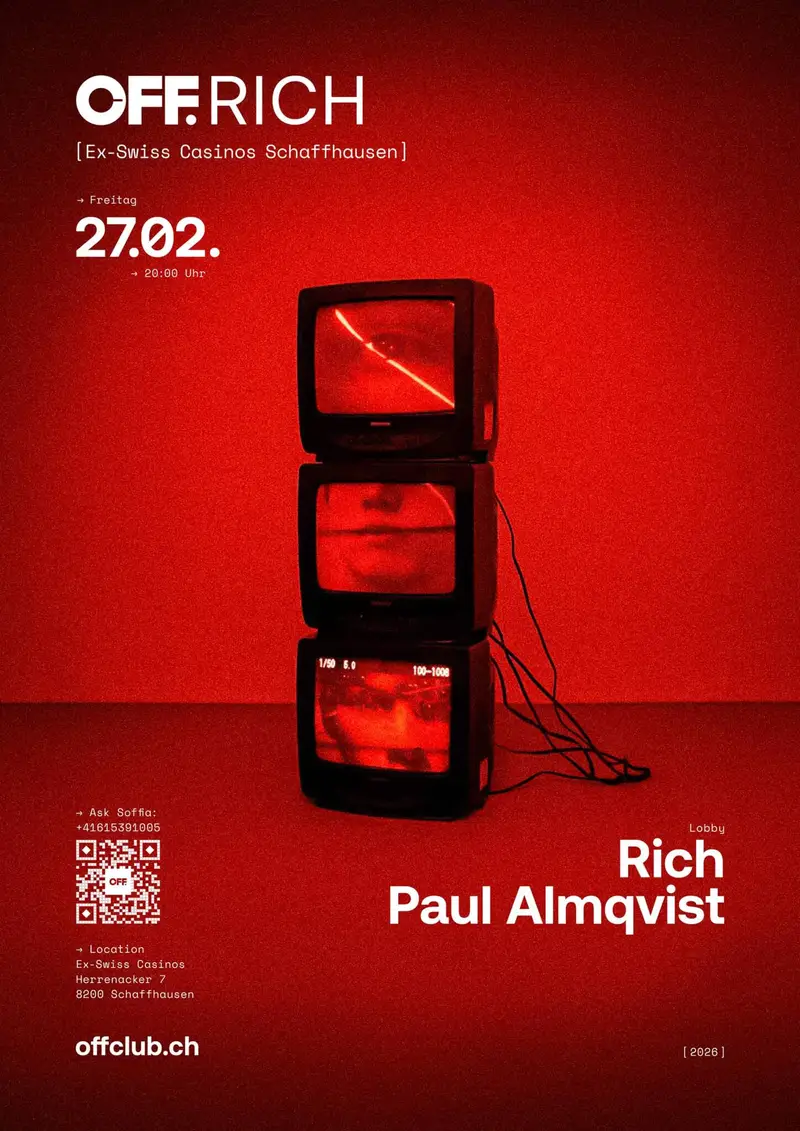 Ex-Swiss Casinos Schaffhausen Herrenacker 7,Schaffhausen,SwitzerlandLobby: House & Classics Am Freitag, dem 27. Februar 2026, wird DJ Rich uns alle Ehre machen. Er prägt seit geraumer Zeit die Ostschweizer House-Szene, und seine Veranstaltungen rund um Frauenfeld sind Kult und stets ausverkauft. An seiner Seite steht Paul Almqvist. Der gebürtige Deutsche lebt seit einiger Zeit in Zürich und weiss genau, welche… Weiterlesen »OFF. RICH – Ex-Swiss Casinos Schaffhausen