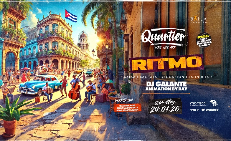 Quartier Klub Schaffhausen Stadthausgasse 13,Schaffhausen,SwitzerlandRITMO de «Baila-Conmigo» 🎉 Am Samstag, 24. Januar erwartet dich im QUARTIER Klub eine karibische Nacht voller Rhythmus, Leidenschaft und purer Lebensfreude! 💃🏽🕺🔥 Erlebe unsere Latin-Party im QUARTIER Klub!! Ein unvergesslicher Abend mit leckeren Drinks, top DJs und spektakulärem Ambiente. 🎶 DJ GALANTE bringt den Salsa-Floor mit den besten Beats zum Kochen. Starte den Abend um 20 Uhr… Weiterlesen »RITMO – Quartier Klub Schaffhausen
