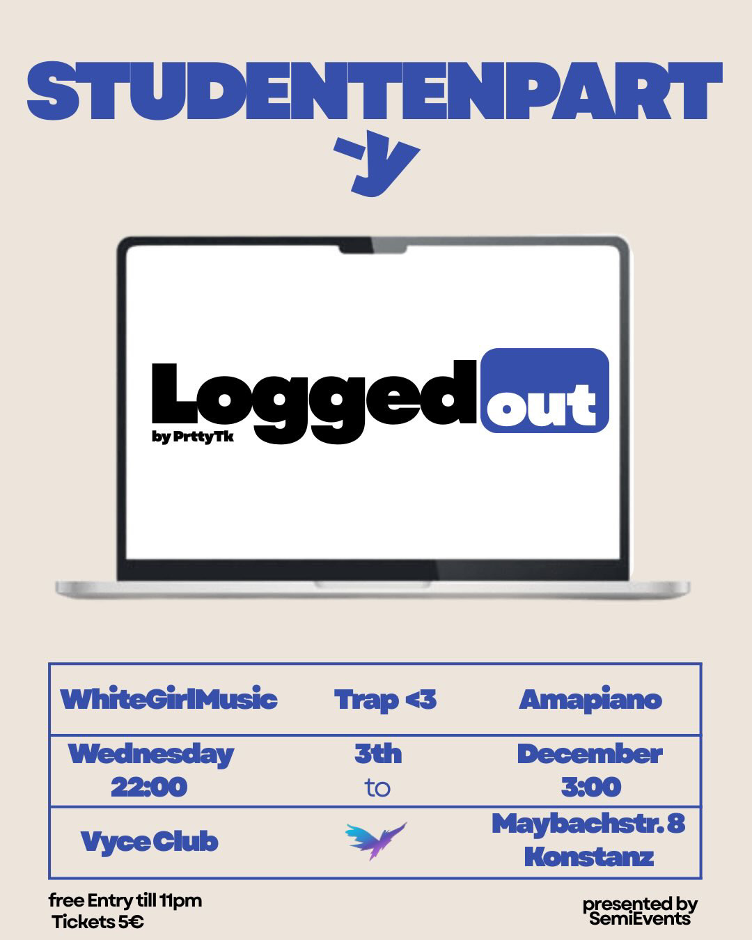 VYCE Konstanz Maybachstraße 8,Konstanz,GermanyLogged out - Die Party, die dich aus dem Uni-Stress katapultiert! im @vycekonstanz DJ: @prttytk White Girl Music, Trap & Amapiano bis 3 Uhr früh. Free Entry bis 23 Uhr!