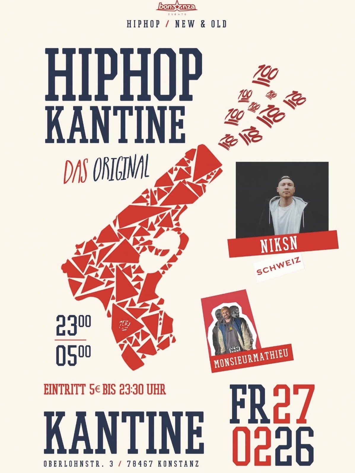 Kantine Konstanz Oberlohnstraße 3,Konstanz,GermanyFREITAG 27/02/26 @hiphopkantine_dasoriginal @kantinekn Offen von 23-5 Uhr Hip Hop statt Hitspop Old School Hip Hop | New School Hip Hop | Club Classics Eintritt bis 23:30 nur 5€ DJS: @niksn_ (Schweiz) @dj.monsieurmathieu (KN - HHK Resident) Zurück aus der Winterpause Manche schmeißen mit Böllern oder verkleiden sich, um die bösen Geister des Winters zu… Weiterlesen »Hip Hop – Kantine Konstanz