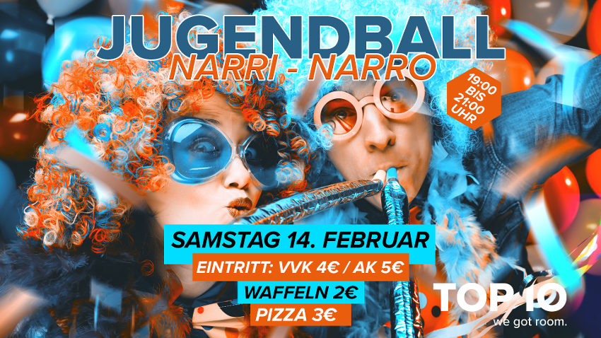 TOP10 Singen Otto-Hahn-Str. 5,Singen (Hohentwiel),Germany🎭🔥 Fasnet Teenie-Party im Top10 Singen 🔥🎭 Am Samstag, den 14.02.2026, geht die Fasnet im Top10 Singen weiter!Von 19:00 bis 21:00 Uhr feiern wir eine Fasnet-Party speziell für Teenager von 12 bis 17 Jahren. 🎉 Das erwartet euch: Coole Spiele & Aktionen Gute Stimmung und Fasnets-Vibes Verkleidungen sind erwünscht, aber kein Muss Frische Waffeln für 2,- € Pizza für 3,- € 🎟 Eintritt: 4,- € im Vorverkauf 5,-… Weiterlesen »Teenie Party Jugendball – Top10 Singen