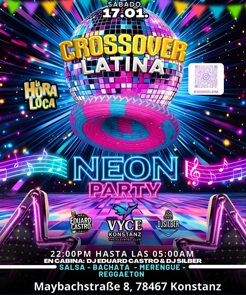 VYCE Konstanz Maybachstraße 8,Konstanz,Germany¡Tenemos una sorpresa! Queremos empezar el año con mucha energía y color, y por eso... ¡estamos preparando una fiesta full NEON que no te puedes perder! Fecha: 17.01 Temática: NEÓN… Weiterlesen »Crossover Latina – VYCE Konstanz
