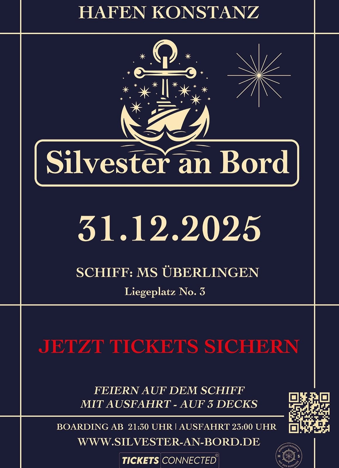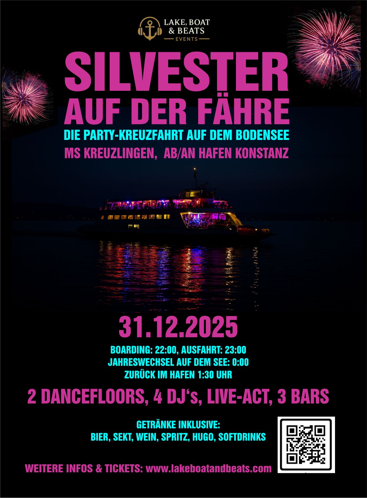 Silvester auf dem Bodensee - Feiere den Jahreswechsel an Bord! Ein Schiff, drei Decks, 1.000 Menschen - und du mittendrin. Tanzflächen, Beats aus drei Jahrzehnten, Fingerfood, Freigetränke und ein Panorama-Feuerwerk, das dir den Atem raubt. Boarding ab 21:30 Uhr Leinen los um 23:00 Uhr Feuerwerk über dem See Party bis 3 Uhr Wer den Abend… Weiterlesen »Silvester an Board – Hafen Konstanz