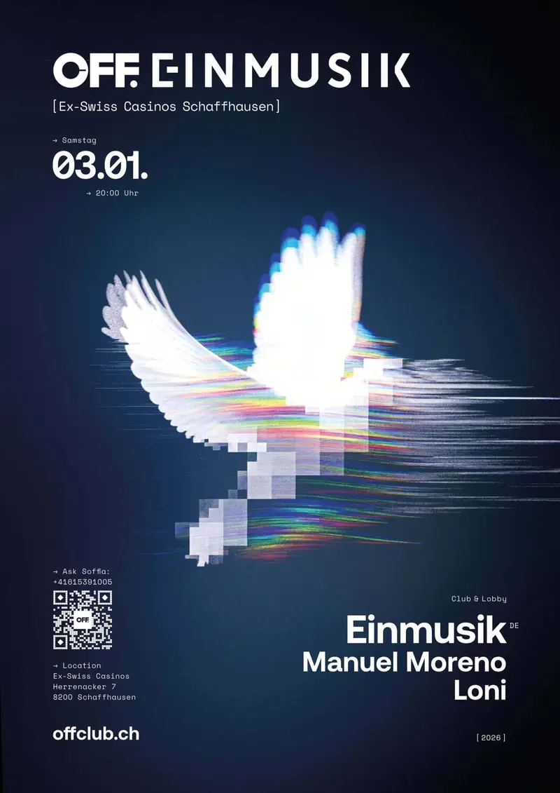 Club & Lobby: Elektronische Musik Kaum ist das neue Jahr angebrochen, erwartet euch im OFF Pop-up-Club auf dem Herrenacker 7 in Schaffhausen das nächste grosse Highlight: Der Berliner Künstler Einmusik, einer der prägendsten Vertreter der internationalen Melodic-Techno-Szene, bringt am Samstag, dem 3. Januar 2026, seinen einzigartigen Sound in die historischen Mauern des ehemaligen Swiss Casinos.… Weiterlesen »OFF. EINMUSIK – Ex-Swiss Casinos Schaffhausen