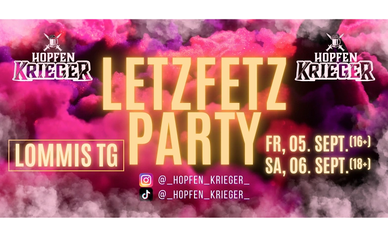 Letzfetz Party Lommis – Zwei Nächte, ein Ziel: Abriss Am Freitag, 05.09.2025 und Samstag, 06.09.2025verwandelt sich Lommis TG in die ultimative Partylocation – mit satten Beats, guter Stimmung und einem Programm, das keine Wünsche offenlässt. Was euch erwartet: Feinste Musik von angesagten DJs, eine Bar mit fairen Preisen, Verpflegung und als besonderes Highlight: ein mobiler… Weiterlesen »Letzfetz Party Lommis