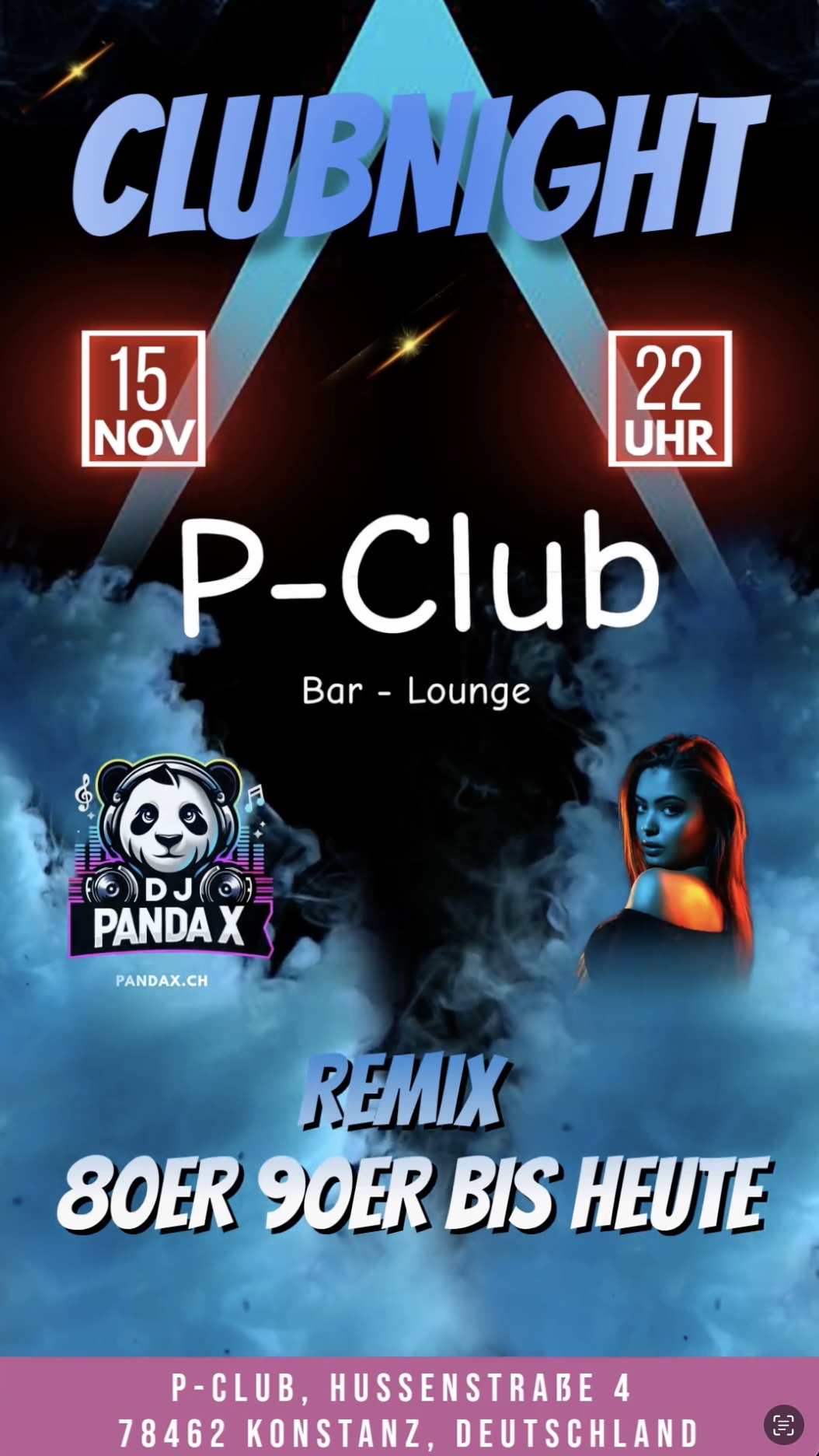 CLUBNIGHT mit DJ PandaX 🐼 Remix 80er 90er bis heute DJ PandaX bringt dir die grössten Hits der 80er, 90er bis heute – komplett neu, fett gemixt und clubtauglich verpackt. Erlebe eine Nacht voller Remixe und Dance-Versionen legendärer Klassiker, gepaart mit modernen Clubbeats von heute. 💃 Tanzen, feiern, mitsingen – CLUBNIGHT 📅 Samstag, 15. November… Weiterlesen »Clubnight mit DJ PandaX im P-Club Konstanz