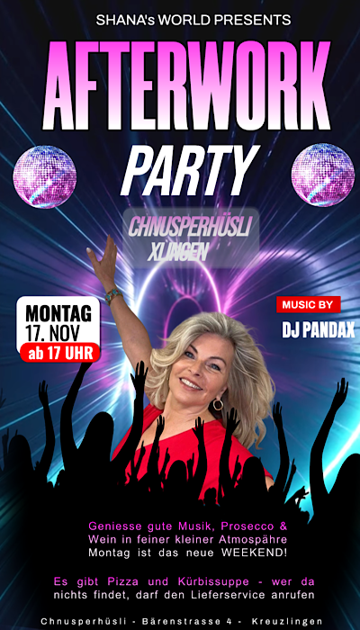 Shanas World presents: AFTERWORK PARTY Montag, 17. November ab 17:00 Uhr Chnupserhüsli Xlingen Der Montag hat ab sofort ein neues Image – Montag ist das neue WEEKEND! 🎉 Also Schluss mit Couch, Serien und „heute nicht“… wir starten direkt in die Woche rein – mit DJ PandaX, guter Musik, Prosecco & Wein in richtig feiner,… Weiterlesen »Afterwork Party – Chnupserhüsli Kreuzlingen |