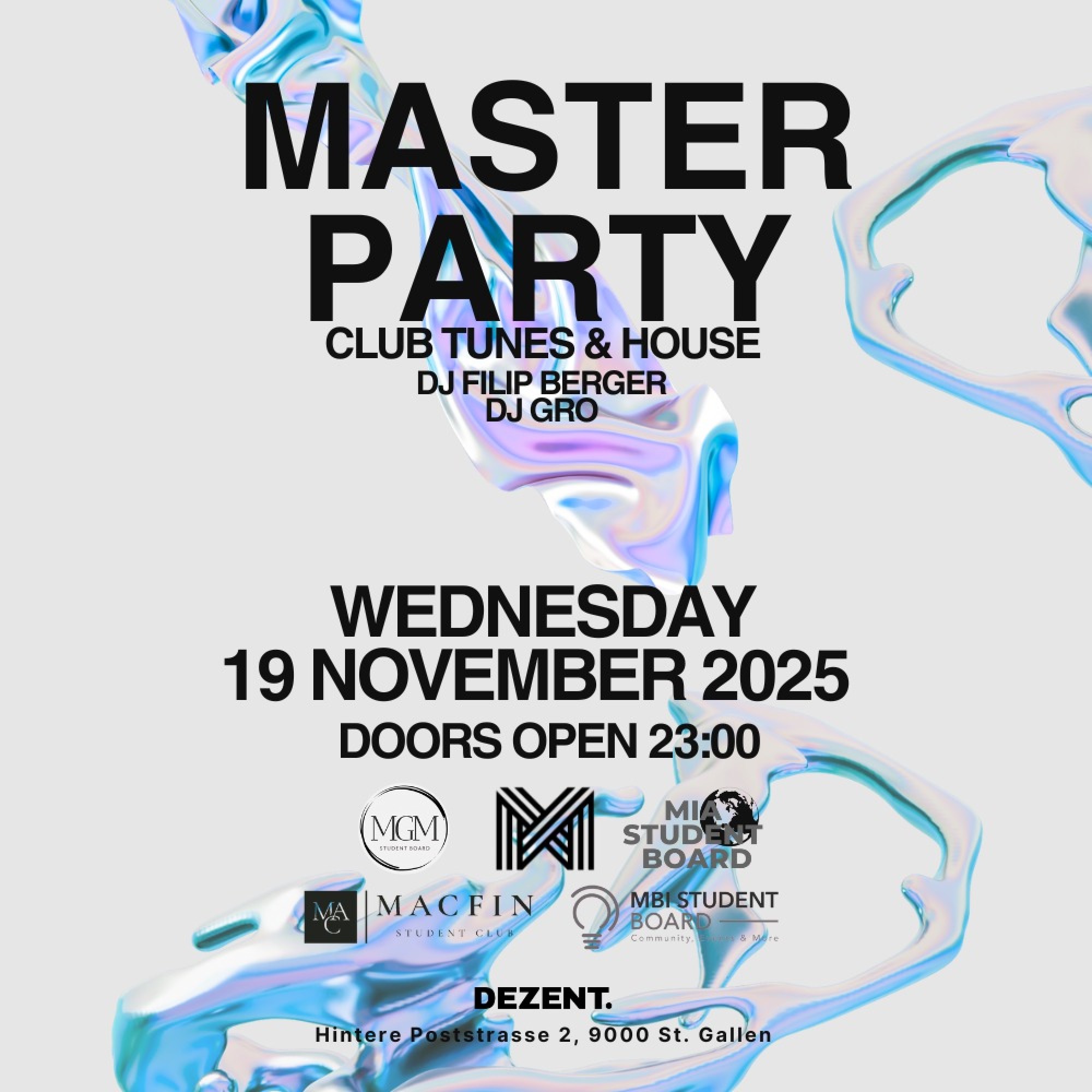 🎓 HSG Master Party HS25 @DEZENT.🎶 Club Tunes & House – Wednesday, 19 November 2025, from 23:00. Join the official HSG Master Party HS25 – hosted by the Master programs of the University of St. Gallen! Experience an unforgettable night filled with energy, good vibes, and the best club sound St. Gallen has to offer.… Weiterlesen »HSG Master Party – Dezent St. Gallen |