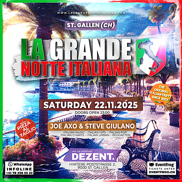 LA GRANDE NOTTE ITALIANA BIG OPENING DEZENT ST. GALLEN - Ciao San Gallo - Samstag, 22. November 2025 @ Dezent Club St. Gallen >>> Ticket <<< Signore e Signori, Italien – ein Land voller Schönheit, Genuss und unvergesslicher Momente. Nicht nur für seine atemberaubenden Landschaften, das köstliche Essen und die charmanten Dörfer ist es weltberühmt, sondern auch für… Weiterlesen »La Grande Notte Italiana – Dezent St. Gallen |