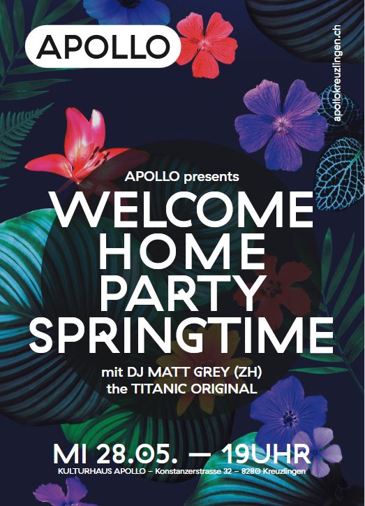 APOLLO Kreuzlingen Konstanzerstrasse 32,Kreuzlingen,SwitzerlandAm Mittwoch, 28. Mai wird das Kulturhaus APOLLO in Kreuzlingen zur Bühne für die WELCOME HOME PARTY – SPRINGTIME! Mit an den Decks: DJ MATT GREY (dasBoot, TITANIC, usw.) Start ist um 19 Uhr – wir feiern den Frühling, das Leben und das Wiedersehen!