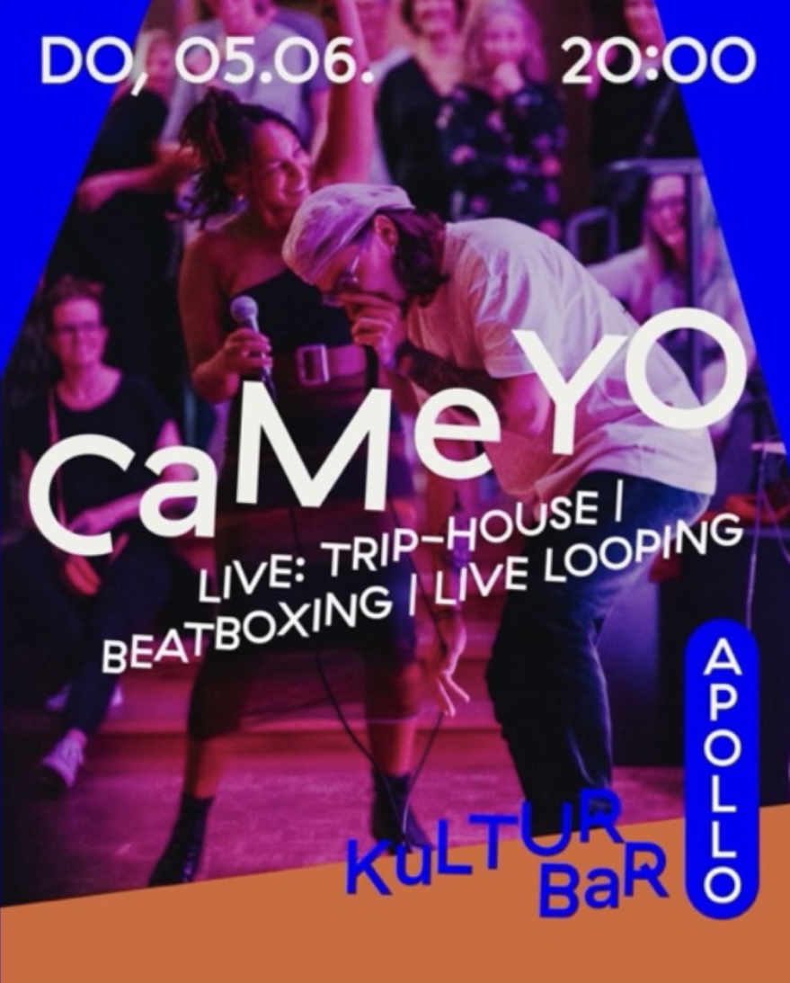 APOLLO Kreuzlingen Konstanzerstrasse 32,Kreuzlingen,SwitzerlandDas Duo Cameyo spielt live für euch im APOLLO. Die beiden Musiker:innen aus Berliner und Konstanzer bringen nicht nur eure Ohren zum Glühen sondern berühren und bewegen mit ihrem einzigartigen Sound aus Trip-House, Beatboxing und Live Looping. Ein Happening und pure Lebensfreude getragen von intuitiver Musik und kreativer Lust am Ausprobieren neuer Klänge. Cameyo stehen… Weiterlesen »Cameyo in Apollo Kreuzlingen