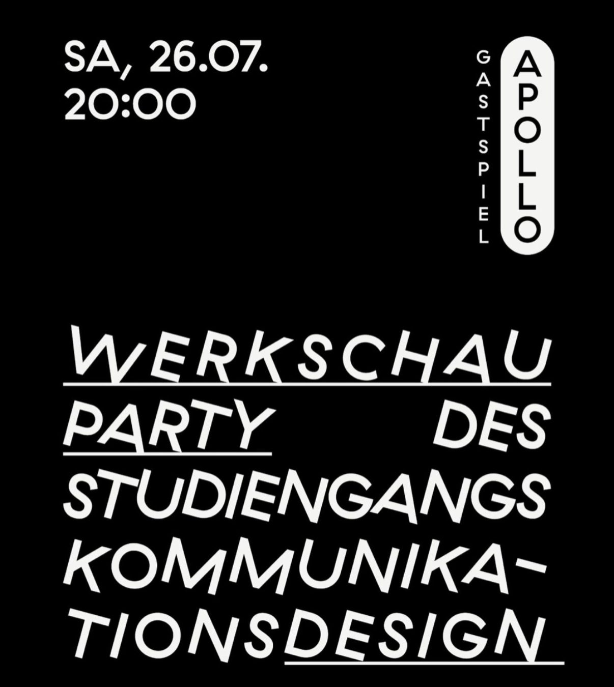 APOLLO Kreuzlingen Konstanzerstrasse 32,Kreuzlingen,SwitzerlandSa, 26.07.2025 | 20:00 | Gastspiel: Werkschau-Party Design Der Studiengang Kommunikationsdesign der HTWG Konstanz @design_in_konstanz feiert den Abschlussjahrgang des Sommersemesters 2025 mit einer rauschenden Party. Im Anschluss an die Werkschau-Ausstellung @werkschaukonstanz der Arbeiten findet im APOLLO die öffentliche Aftershow-Party statt. Verschiedene DJs legen auf, die Studi-Band spielt live - diese Nächte sind legendär. Sa, 26.… Weiterlesen »Werkschau Party – Apollo Kreuzlingen