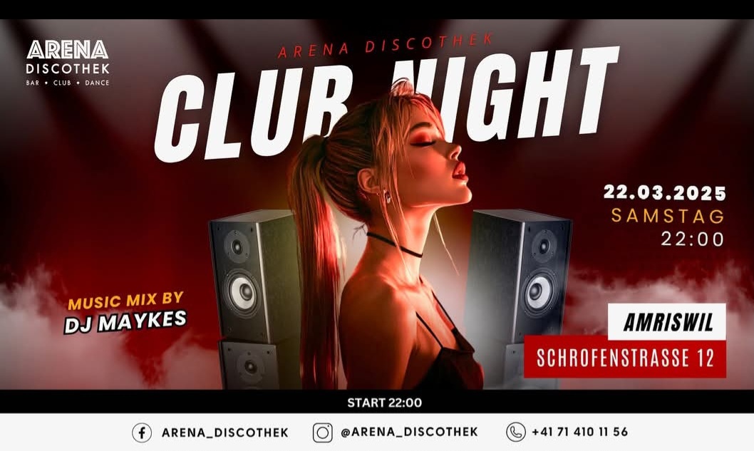Mood12 Amriswil Schrofenstrasse 12,Amriswil,Switzerland🔥 22 marca 2025 r. 🔥 NOC KLUBOWA w dyskotece Arena! 🎉✨ Po niesamowitej imprezie tydzień temu, zabawa trwa dalej – 22 marca w dyskotece Arena czeka na Was NOC KLUBOWA! Przeżyj noc pełną energii, porywających rytmów i niezapomnianej atmosfery! 🚀🎶 🎧 Gościem specjalnym wieczoru będzie DJ MAYKES – rozkręci parkiet i stworzy… Weiterlesen »CLUB NIGHT in der Arena Discothek! 🎉✨