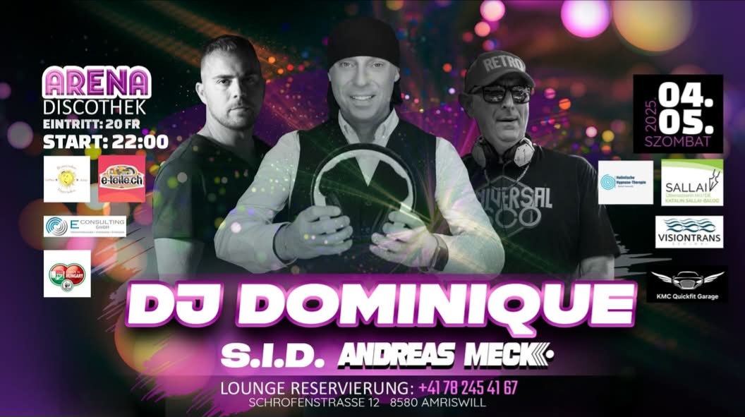 Mood12 Amriswil Schrofenstrasse 12,Amriswil,SwitzerlandDJ Dominique dał bardzo swobodny i rozrywkowy występ na żywo. Wydarzenie, w którym można zdobyć nagrody, 36 elementów, 5 platyny, valamint 2 podwójne platyny, bardzo tulajdonosa. W 1992 roku wydał swój pierwszy album, którego producentem był DJ Dominique Néven. Cena: 22,00 Godzina: 04.00 Belépő: 20 Fr, atmosfera podobna do helisyny. (Figi Twintes vagy kespénzes) Przy… Weiterlesen »Magyar party | Dj Dominique Svájcban