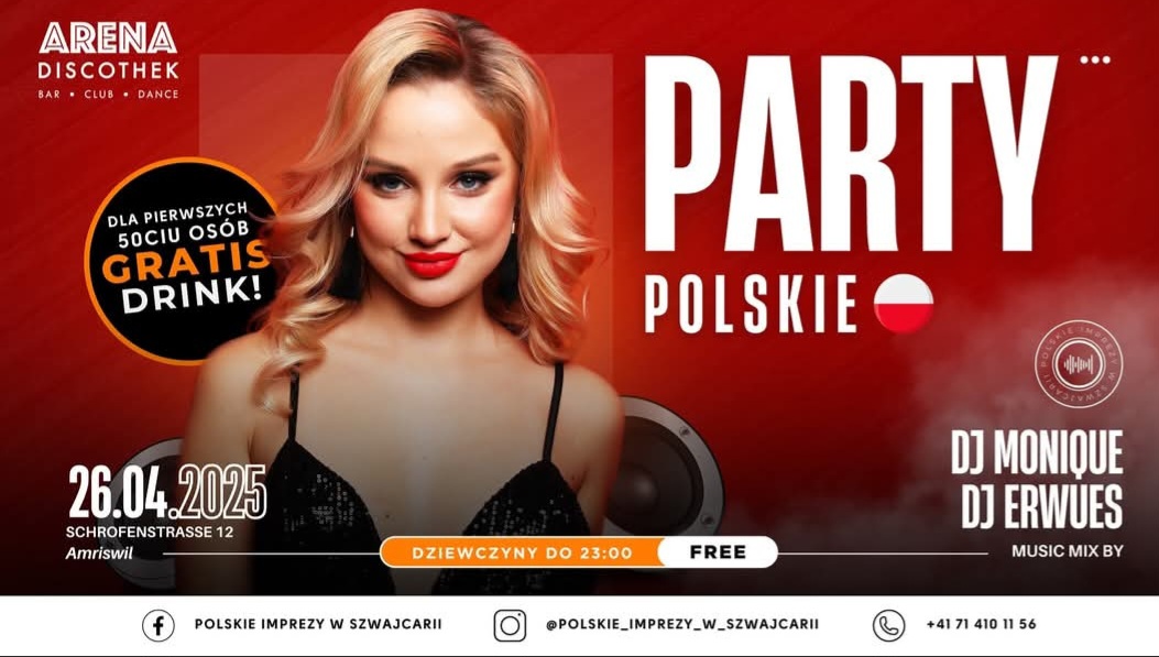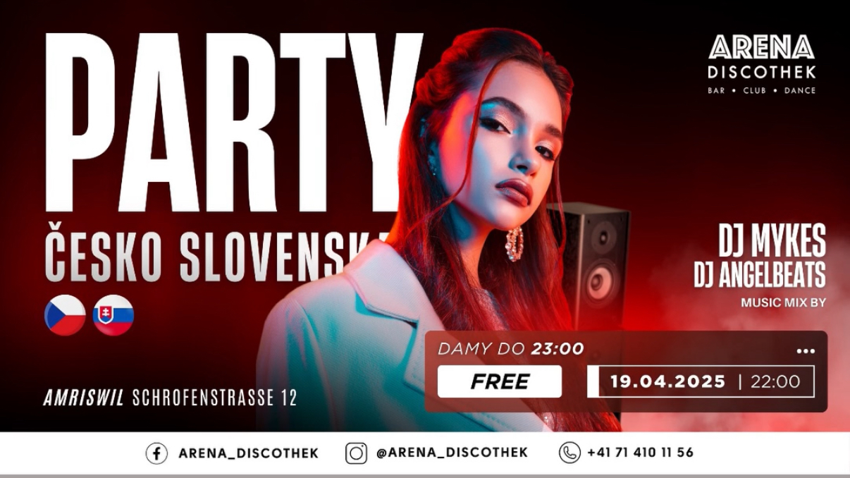 Mood12 Amriswil Schrofenstrasse 12,Amriswil,Switzerland🔥 29.03.2025 🔥 🇵🇱🇨🇿🇸🇰 POLSKO - ČESKO - SLOVENSKÁ PARTY w Arena Discothek! 🎉 #Night19 🎟️ Panie?/Dámy? 👉 FREE do 23:00 ❤️ 💕 🇵🇱✨ Dla pierwszych 50 osób DRINK GRATIS! 🍹🔥 Nie przegap tej okazji! 🇸🇰🇨🇿 ✨ Pre prvých 50 osôb DRINK ZADARMO! 🍹🔥 Nezmeškaj túto šancu! 🇵🇱 Wracamy z legendarną edycją Polsko… Weiterlesen »🇵🇱🇨🇿🇸🇰 POLSKO – ČESKO – SLOVENSKÁ PARTY w Arena Discothek! 🎉 #Night19