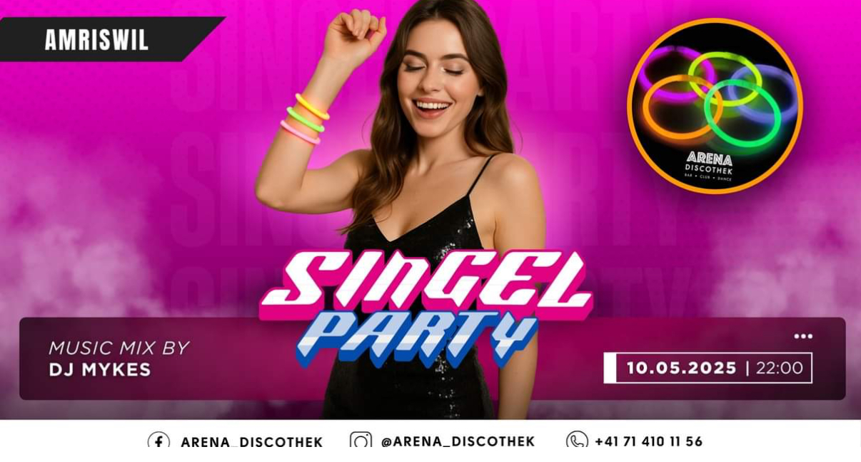 Mood12 Amriswil Schrofenstrasse 12,Amriswil,SwitzerlandSingle Party - 10.05.2025 Flirt, Fun & Feierlaune in der Arena Discothek! Ob vergeben oder noch zu haben - bei unserer Single Party steht der Spaß im Vordergrund! Lerne neue Leute kennen, genieße einen unvergesslichen Abend und tanze bis in die frühen Morgenstunden! DJ Mykes bringt euch mit einem energiegeladenen Club-Mix zum Ausrasten - fette… Weiterlesen »Single Party in Arena Amriswil