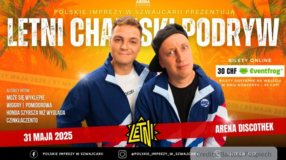Mood12 Amriswil Schrofenstrasse 12,Amriswil,Switzerland📅 Kiedy? 👉 31 maja 2025 (sobota) 📍 Gdzie? 👉 Arena Discothek, Schrofenstrasse 12, 8580 Amriswil ⏰ O której? 👉 Start o 22:00 💸 Cena biletu: 👉 30 CHF online / 35 CHF na wejściu w dniu koncertu Przygotujcie się na wieczór pełen śmiechu, szalonej energii i totalnego luzu! 😎 Zespół Letni Chamski Podryw rozbawi… Weiterlesen »LETNI CHAMSKI PODRYW in Arena Amriswil