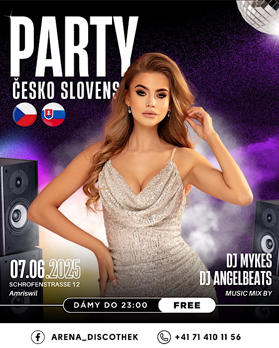 Mood12 Amriswil Schrofenstrasse 12,Amriswil,SwitzerlandCESKO-SLOVENSKÁ NOC V ARENÉ! Sobota, 07.06.2025 Arena Discothek - Amriswil (TG) Start: 22:00 Po uspechu prvej edície je spät Cesko - Slovenská Noc! Jedineiný vecer venovaný hudbe, kultúre a zábave nasich krajín! DJ ANGELBEATS (SK) sa postará o ten najlepsí vibe az do rána! Priprav sa na legendárne hity aj klubové novinky Stýle, ktorý milujes!… Weiterlesen »Party in Arena Amriswil