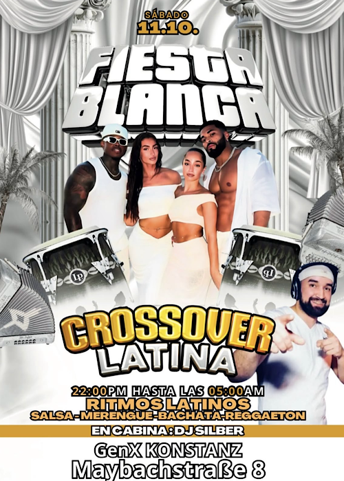 VYCE Konstanz Maybachstraße 8,Konstanz,Germany¡En tres semanas nos vemos en la Fiesta Blanca! La mejor Fiesta Latina de la ciudad - llena de ritmo, sabor y energía. Música latina Baile sin parar Ambiente único 11.10. GenX Konstanz 22:00 am - 05:00 pm Dresscode: Blanco ¡No te lo pierdas! In drei Wochen sehen wir uns auf der White Party! Die… Weiterlesen »Crossover Latina – GenX Konstanz