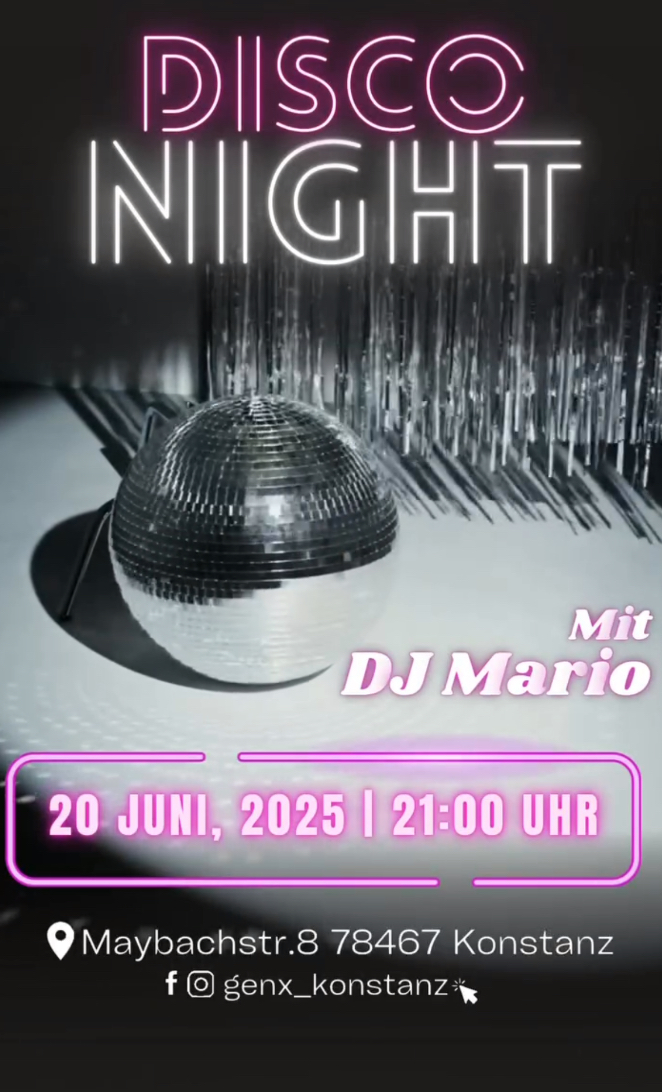 VYCE Konstanz Maybachstraße 8,Konstanz,GermanyDisco-Feeling pur - Glitzer, Beats, Bewegung.... Disco Night | 20. Juni 2025 | ab 21:00 Uhr Licht aus - Kugel an! Tauche ein in die Glitzerwelt der Disco Night im Club GenX. Mit den besten Disco-Vibes, echten Dancefloor-Klassikern und DJ Mario am Pult erwartet dich eine Nacht voller Bewegung, Licht und legendärem Sound. Maybachstr. 8,… Weiterlesen »Disco Party im GenX Konstanz