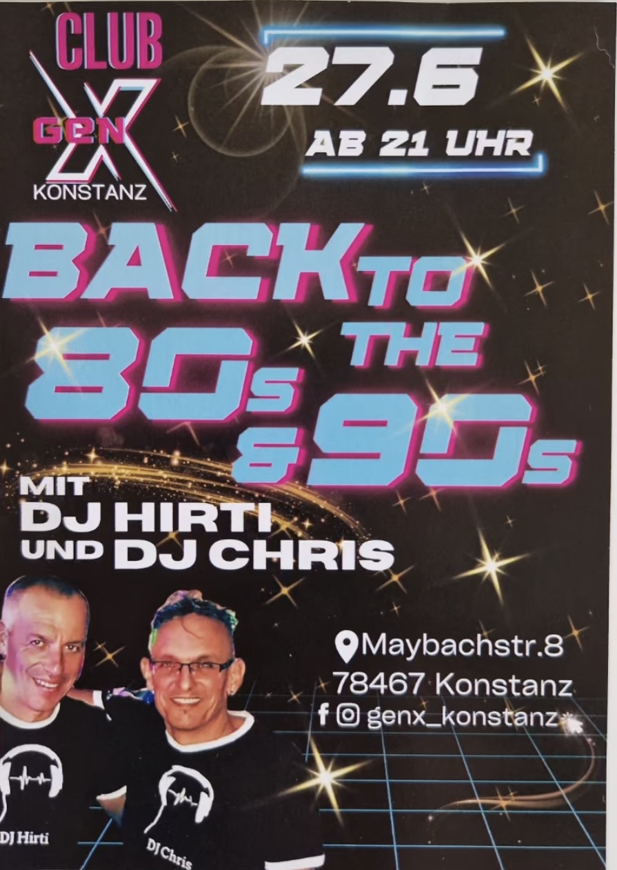 VYCE Konstanz Maybachstraße 8,Konstanz,GermanySave the Date! We are back! New Location! 27.06.2025 im GENX - DJ Chris & DJ Hirti mit den Best of 80's & 90's and Mixes. Best Party in Town 👌 Lasst uns diesen Abend gemeinsam feiern! Vorverkauf 8€ und Tickets gibt es hier: GenX DJ Hirti DJ Chris Meisterklause Kiosk an der Fähre Kiosk… Weiterlesen »DJ Chris & DJ Hirti im GenX Konstanz