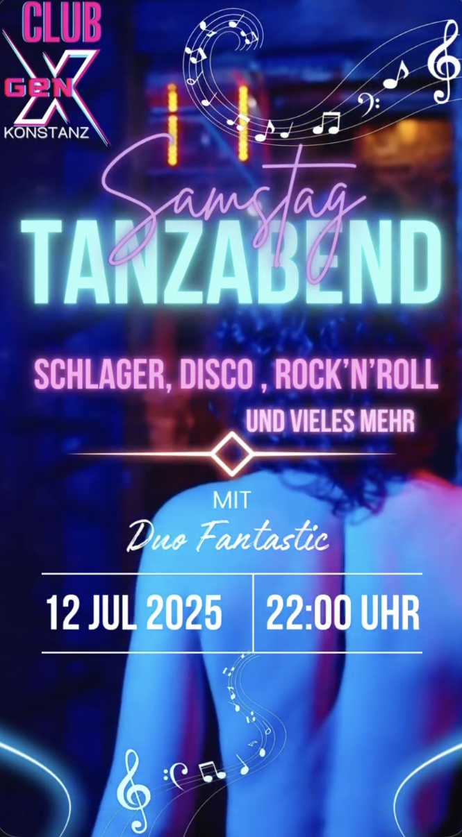 VYCE Konstanz Maybachstraße 8,Konstanz,GermanySamstag = TANZABEND Am 12. Juli bringen wir Club GenX zum Beben - mit einem Musikmix, der Generationen verbindet! Schlager, Disco, Rock'n'Roll & mehr - live gespielt vom Duo Fantastic! Ob Tanzprofi oder einfach gut gelaunt - bei uns zählt der Spaß! GenX, Maybachstraße 8, Konstanz Start: 22:00 Uhr w Komm früh, tanz lange, lach… Weiterlesen »Tanzabend – GenX Konstanz