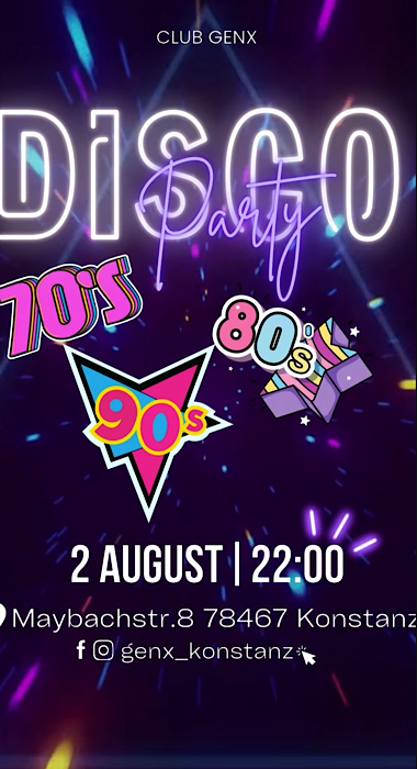 VYCE Konstanz Maybachstraße 8,Konstanz,GermanyEine Nacht - drei Jahrzehnte - unendlich viele Hits! Am 2. August nehmen wir dich mit auf den Dancefloor der 70er, 80er & 90er - mit allem, was du liebst: Disco-Vibes, Neonlicht, Retro-Hits und Tanzklassiker nonstop! Egal ob du mit Schlaghose oder Buffalos kommst - ab 22:00 Uhr bringt GenX deine Lieblingsjahrzehnte zurück auf die… Weiterlesen »Disco Party – GenX Konstanz