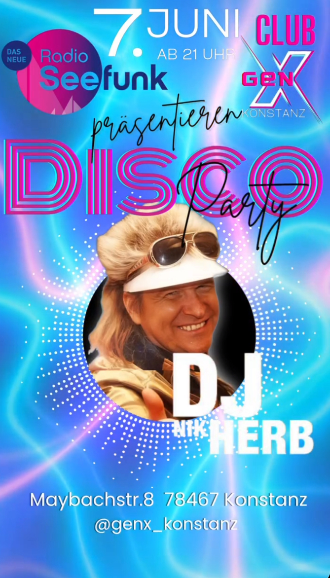 VYCE Konstanz Maybachstraße 8,Konstanz,GermanyBereit für die heißeste Zeitreise des Jahres? SAVE THE DATE - 7. Juni! Disco Fever im Club GenX mit Star-DJ HERB! Freu dich auf eine Nacht voller 80er, 90er & 00er-Hits, funky Vibes und einer Stimmung, die du nie vergisst! Presented by Radio Seefunk Spd Greatest Hits - All Night Long! GenX, Maybachstr. 8, 78467… Weiterlesen »Radio Seefunk Disco Party in GenX Konstanz