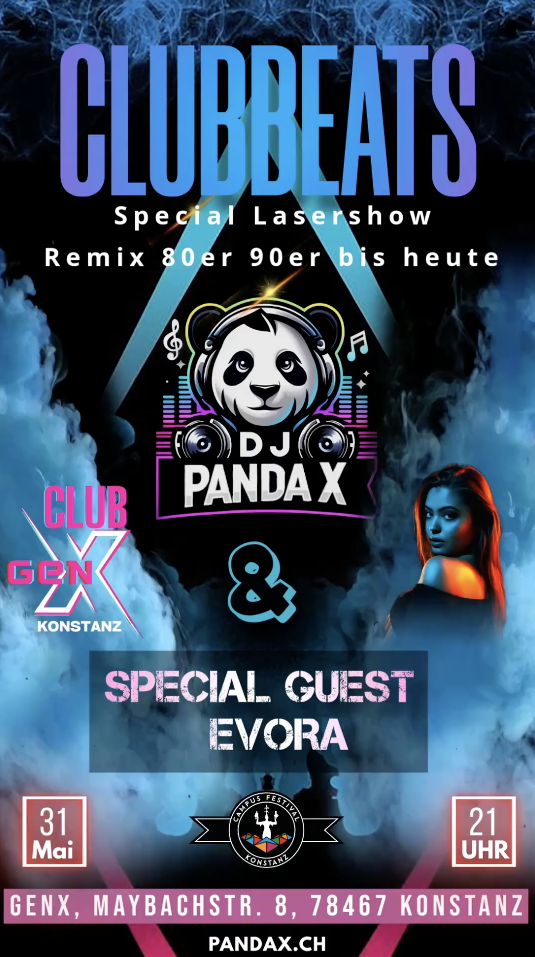 VYCE Konstanz Maybachstraße 8,Konstanz,Germany🎉CLUBBEATS mit DJ PandaX & Special Guest Evora🎉 Remixe der 80er, 90er und von heute 📍Club Genx | 📅 Samstag, 31. Mai 2025 | 🕘 Start: 21:00 Uhr Bereit für den Sound, der deinen Samstag unvergesslich macht? DJ PandaX übernimmt die Decks und bringt den Club Genx mit fetten Beats, treibenden Bässen und feinsten… Weiterlesen »Campus Festival After-Show CLUBBEATS mit DJ PandaX in GenX Konstanz
