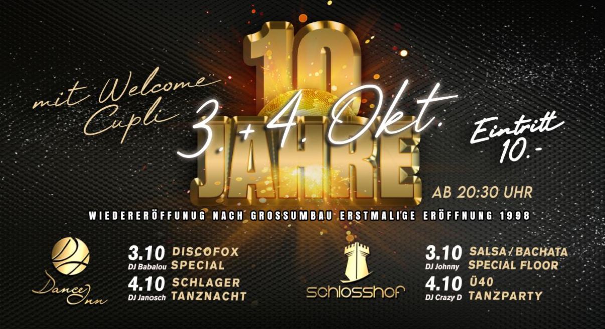 DanceInn Schlosshof Münchwilen Murgtalstrasse 20,Münchwilen,Switzerland🥂 10 JAHRE DANCE INN 🥂 FREITAG 03. OKTOBER 2025 im DANCE INN jeweils ab 20:30 10 Jahre Dance Inn – Wir feiern Jubiläum! Nach einer intensiven Umbauphase präsentierte sich das Dance Inn Münchwilen ab Herbst 2015 in neuem Glanz – mit frischem Konzept, neuen Attraktionen und viel Herzblut. Seit dem Umbau ist viel passiert.… Weiterlesen »10 Jahre – Schlosshof & Dance Inn Münchwilen